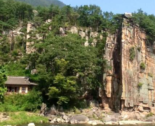 단양 사인암은 단양팔경의 하나로 단양읍에서 남쪽 8㎞ 지점인 대강면 사인암리에 위치해 있습니다. 남조천(일명 운계천) 강변을 따라 화강암으로 구성된 지반 가장자리에 석회암으로 된 암석이 병풍모양의 수직절리를 형성한 모습입니다. 그 풍광이 아름다워 2008년에 명승 제47호로 지정되었습니다. 바위에는 편백나무도 올려져 있어 해금강을 연상시킵니다.