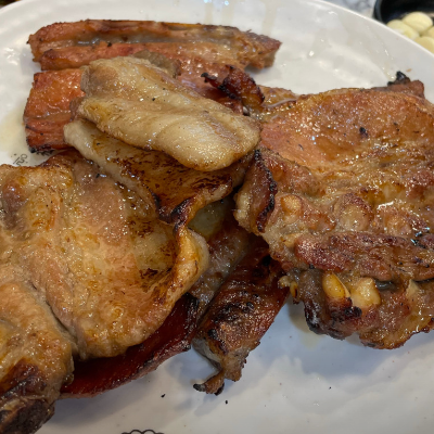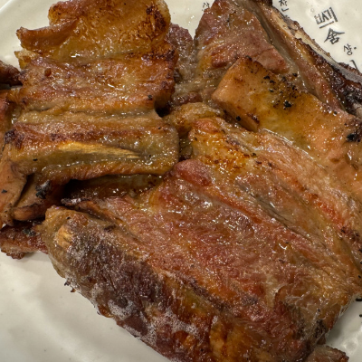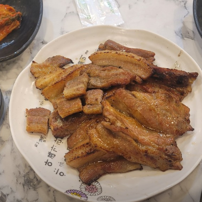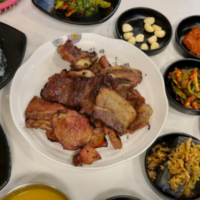 많이 걸어 배가 고팠어서 그런지 맛있게 먹었어요 매장에 들어가자 자리번호 알려주고 메뉴는 고를것도 없이 앉자마자 돼지갈비 구운거 나옵니다 너무 특이했어요.